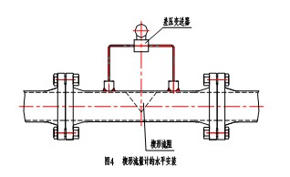 A 水平安裝時(shí),楔形流阻應(yīng)垂直于管道底部的通流部分,以使管道中的固體顆粒能自由通過。見圖4。