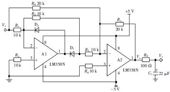精密全波整流電路如圖5所示。Vi是輸入信號(hào),Vx為A2的輸出信號(hào),為了使輸出信號(hào)平滑穩(wěn)定,后面加了一個(gè)由R8和C1組成的濾波電路,Vo為最終的輸出信號(hào)。