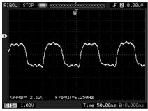 本文采用的是二值勵(lì)磁方式,所以產(chǎn)生的感應(yīng)電動(dòng)勢(shì)也是一個(gè)方波信號(hào)。由于傳感器傳回的感應(yīng)電動(dòng)勢(shì)是非常微弱的,僅有幾十μV左右,一般示波器很難直接檢測(cè)到。經(jīng)過(guò)前置放大電路AD620AN放大后的信號(hào)如圖6所示。