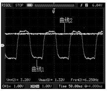 為了消除同相干擾和共模干擾引起的零點(diǎn)漂移。硬件電路中,引入了電平提升電路,它可以有效的使波形關(guān)于零線上下對(duì)稱,然后就可以應(yīng)用精密全波整流電路,將其轉(zhuǎn)換成直流信號(hào),以便單片機(jī)采集。經(jīng)過(guò)電平提升電路和精密全波整流電路后的波形圖如圖9所示。圖9中曲線1的矩形波是感應(yīng)電動(dòng)勢(shì)經(jīng)過(guò)信號(hào)采集電路和電平提升電路后的波形;曲線2是曲線1經(jīng)過(guò)精密全波整流電路后的波形。可以看出經(jīng)過(guò)精密整流電路后的波形幾乎是一條直線,這樣有利于單片機(jī)對(duì)信號(hào)進(jìn)行A/D采樣。