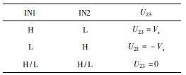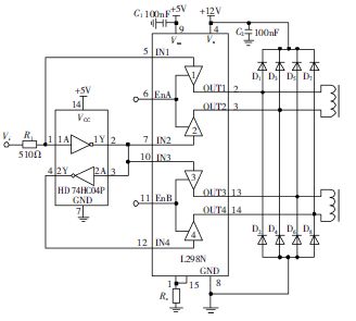 勵(lì)磁電路主要由L298N和HD74HC04P兩款芯片組成,圖2是兩款芯片的內(nèi)部簡(jiǎn)化原理圖。L298N是SGS公司生產(chǎn)的一款內(nèi)部具有兩個(gè)H橋的高電壓大電流的雙全橋式驅(qū)動(dòng)器。能夠驅(qū)動(dòng)46V,2A以下的感性負(fù)載,工作溫度從-25℃~130℃。L298N的引腳4是電感器件電源正端,引腳1和引腳15是電感器件電源負(fù)端,因此引腳4與引腳1和引腳15可形成閉合回路;引腳9是邏輯控制電源的正端,引腳8是邏輯控制電源的負(fù)端;引腳6-EnA和引腳11-EnB分別是第一H橋和第二H橋使能引腳;引腳5-IN1和引腳7-IN2是第一個(gè)H橋電路的控制引腳,它們的不同狀態(tài)值來(lái)決定H橋引腳2-OUT1和引腳3-OUT2的電壓輸出方向。第一H橋輸入引腳狀態(tài)與輸出引腳狀態(tài)真值關(guān)系如表1所示。