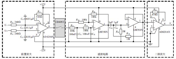 在式(3)中,RG是AD620AN的增益電阻,可通過(guò)調(diào)節(jié)RG來(lái)調(diào)節(jié)AD620AN放大增益。在一級(jí)放大電路和二級(jí)放大電路中,電阻R11和R21分別是AD620的增益電阻RG。