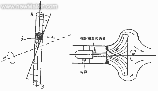 早期設計的科氏力質(zhì)量流量計的結構如圖2所示。將在由活動流體的管道送進一旋轉(zhuǎn)系統(tǒng)中,由安裝在轉(zhuǎn)軸上的扭矩傳感器,來完成質(zhì)量流量的丈量。這種流量計只是在試驗室中進行了試制。