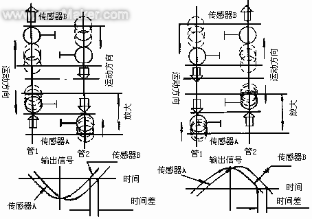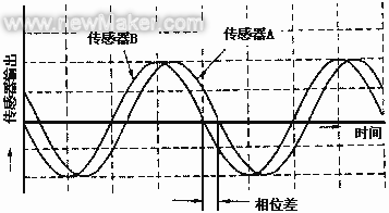 隨著振蕩運動的進行,丈量管被周期性地分開、靠攏,科氏力也周期性地作用在兩根丈量管上,通過安裝在丈量管上的位移創(chuàng)按其A、B,測出由科氏力引起的丈量管相對位置的變化,通常轉(zhuǎn)化為測兩點的相位差,如圖7所示。這個相位差的大小與質(zhì)量流量成正比。