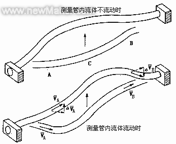 當丈量管中流體以速度V在管中活動時,由于受到C點振動力的影響(此時的振動力是向上的),流體質(zhì)點從A點運動到C點時被加速,質(zhì)點產(chǎn)生反作用力F1,使管子向上運動速度減慢;而在C點到B點之間,流體質(zhì)點被減速,使管子向上的運動速度加快。結果在C點兩邊的這兩個方向相反的力使管子產(chǎn)生一個變形,這個變形的相位差與測管中流體流過的質(zhì)量流量成正比。