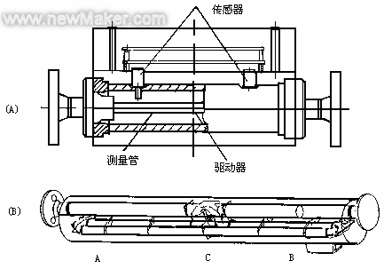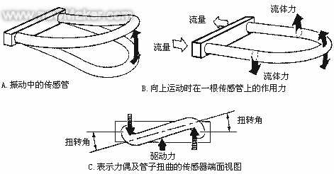 在商品化產(chǎn)品設計中,通過丈量系統(tǒng)旋轉(zhuǎn)產(chǎn)生科氏力是不切合實際的,因而均采用使丈量管振動的方式替換旋轉(zhuǎn)運動。以此同樣實現(xiàn)科氏力對丈量管的作用,并使得丈量管在科氏力的作用下產(chǎn)生位移。由于丈量管的兩端是固定的,而作用在丈量管上各點的力是不同的,所引起的位移也各不相同,因此在丈量管上形成一個附加的扭曲。丈量這個扭曲的過程在不同點上的相位差,就可得到流過丈量管的流體的質(zhì)量流量。