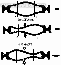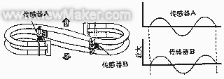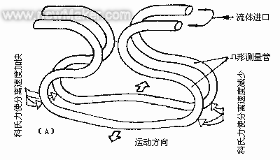如圖23a,當管子分開時,在振點前的流體中產(chǎn)生的科里奧利力與振動力方向相反,減慢管子的運動速度;而在振點之后管中流體產(chǎn)生的科氏力與振動方向相同,加快管子的運動速度。當驅(qū)動器使管子靠近時,如圖23b,則產(chǎn)生相反的結果。在A、B兩點的傳感器可測的兩處管字運動的相位差,由此可得到流過測管中流體的質(zhì)量流量。