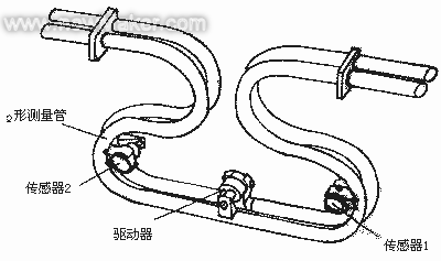 如圖3所示,這種流量計的丈量系統(tǒng)由兩根平行的S形丈量管、驅(qū)動器和傳感器組成。管的兩端固定,管的中心部位裝有驅(qū)動器,使管子振動。在丈量管對稱位置上裝有傳感器,在這兩點上丈量振動管之間的相對位移。質(zhì)量流量與這兩點測得的振蕩頻率的相位差成正比。