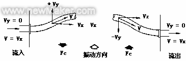 當丈量管中流體不活動時,兩根丈量管在驅(qū)動力作用下(作用在每根管子上的力大小相等、方向相反)作對稱的等振幅運動。由于管子兩端是固定的,在管子中間振幅最大,到兩端逐漸減為零。這時在兩個傳感器上測得的相位如圖4B所示,由圖中可以看出,兩傳感器測得的相位差為零。當丈量管內(nèi)流體以速度V活動時,流體中任意值點的流速,可以為是兩個分流速的合成:水平方向Vx及垂直方向Vy(與振動方向相同)。在恒定流條件下,流體沿水平方向的流速Vx保持恒定。從圖5中可以看出,管子的進、出口處振幅為零,流體質(zhì)點垂直移動速度Vx為零;