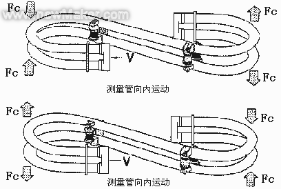 其工作原理如圖12所示,當丈量管中的流體以一定速度活動時,由于振動的存在使得丈量管中的流體產(chǎn)生一個科氏力效應。此科氏力作用在丈量管上,但在上下兩支管上所產(chǎn)生的科氏力的方向不同,管的直管部分產(chǎn)生不同的附加運動,即產(chǎn)生一個相對位移的相位差。